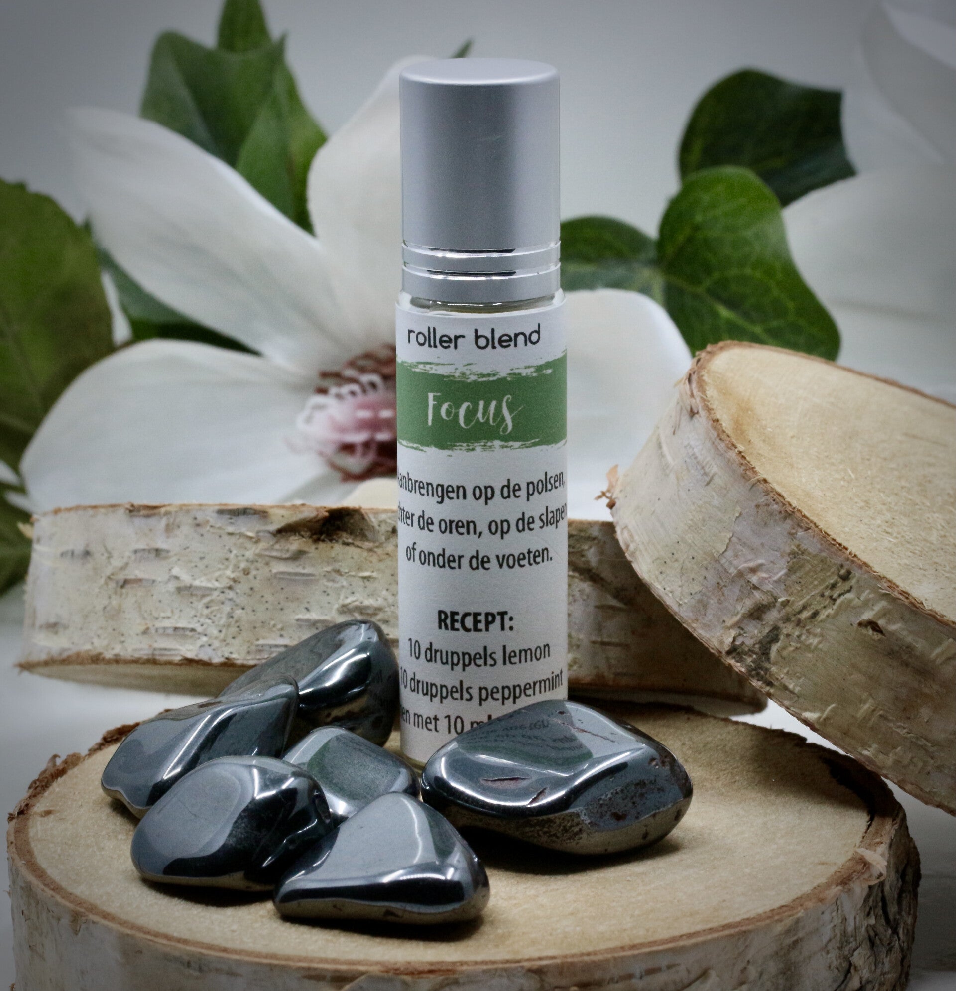 De unieke Focus set bestaat uit een 10 ml roller met etherische olie en een gratis hematiet trommelsteen.